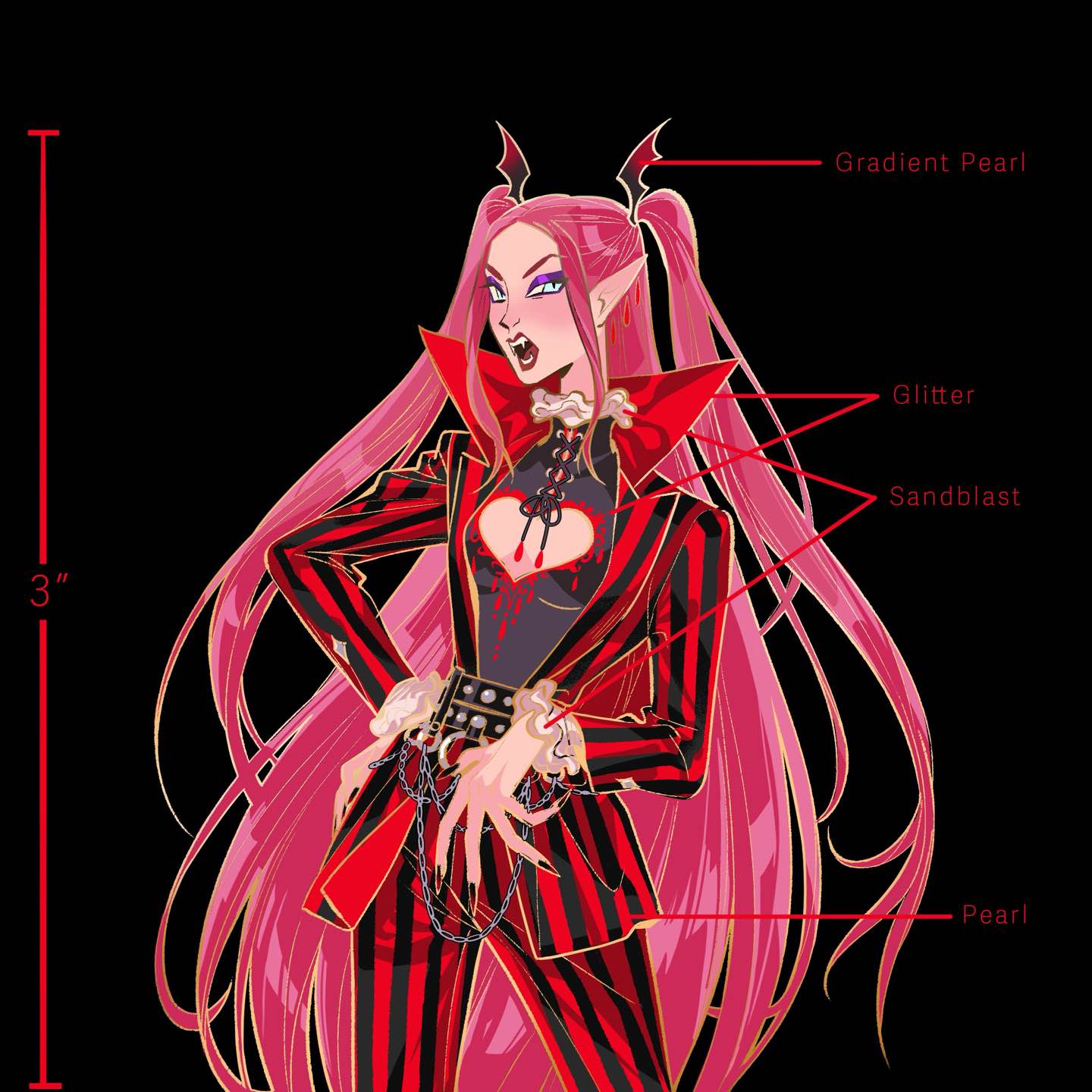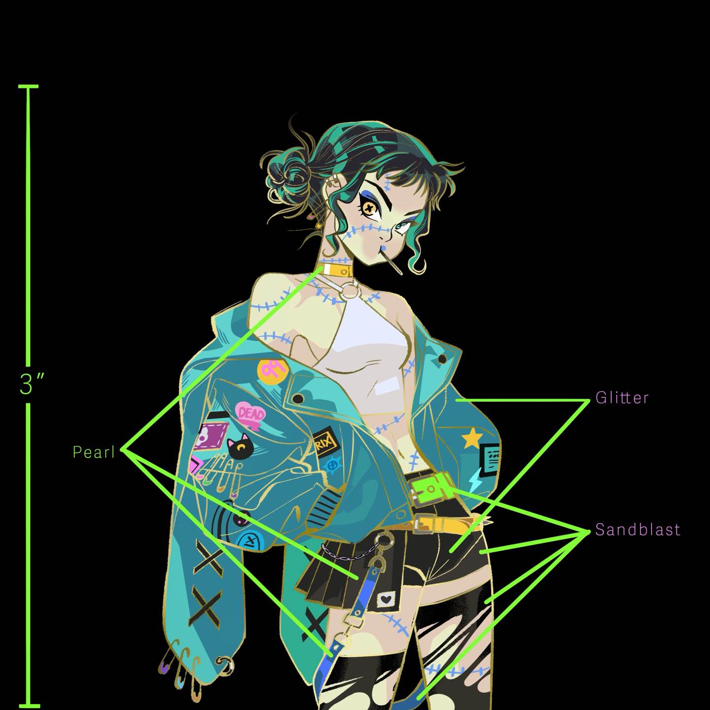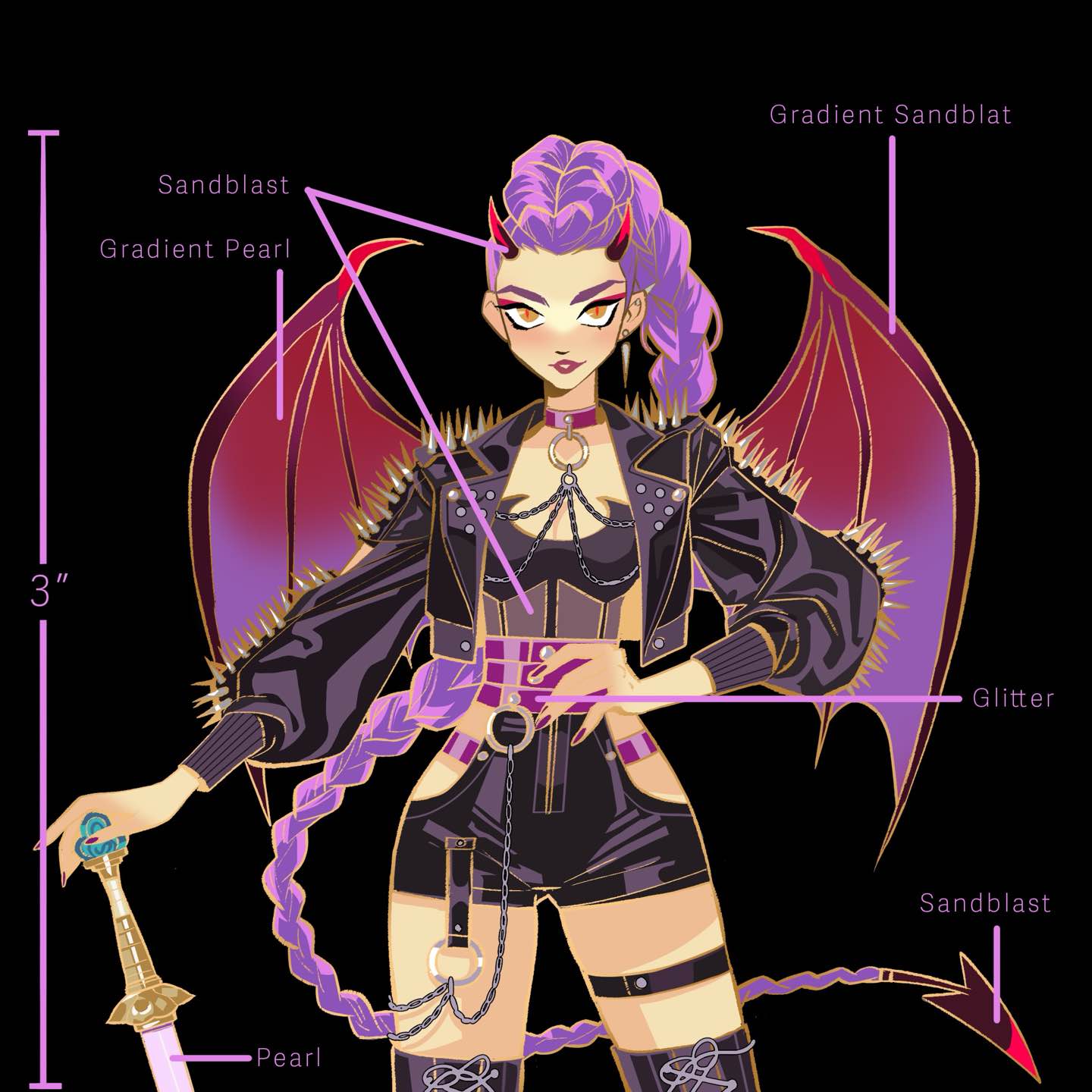 Rumi: Plating gold with screen printed details, uv print, sandblast, gradient sandblast, gradient pearl, glitter, customized back stamp