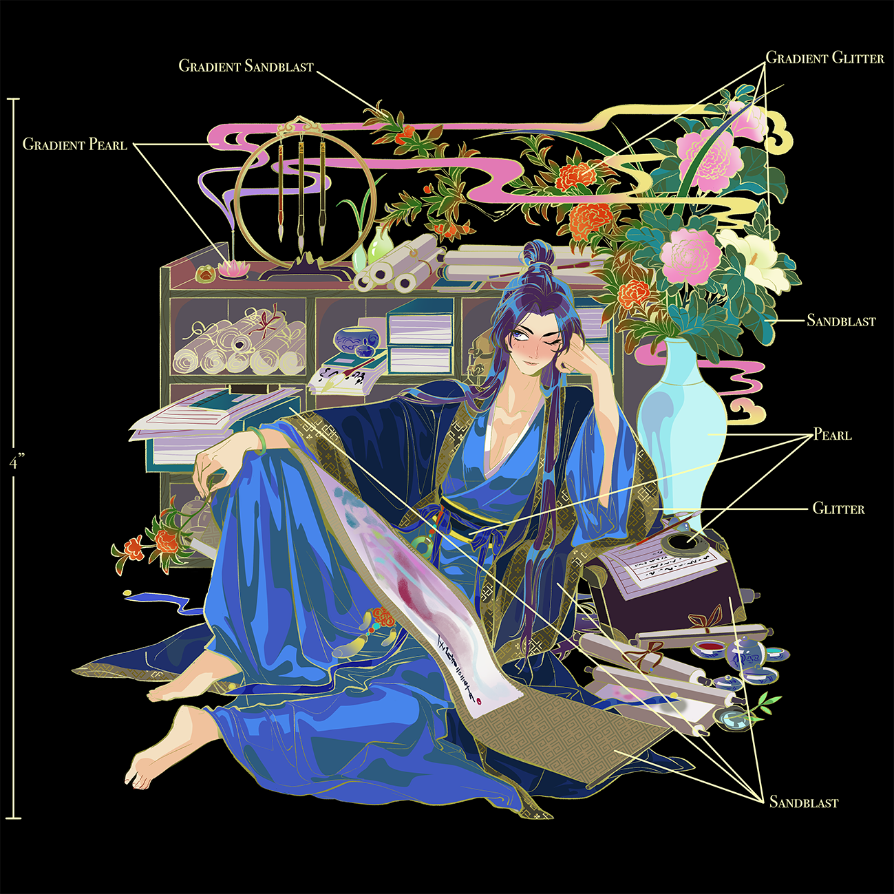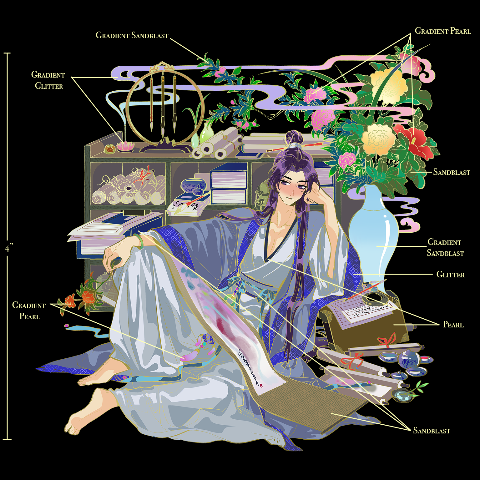 OG: Plating Gold with screen printed details, uv print, sandblast, gradient sandblast, glitter, gradient glitter, pearl, gradient pearl
