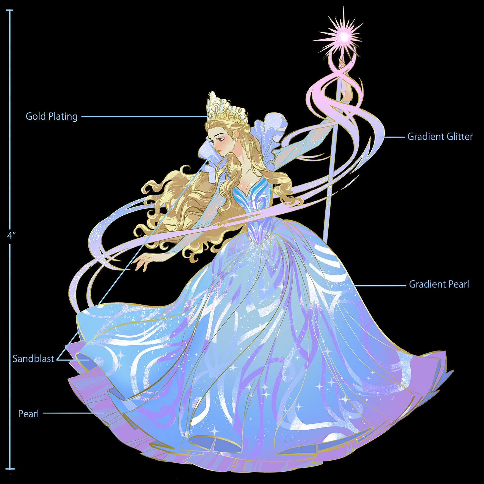 Glinda: Plating Gold with screen printed details, uv print, sandblast, gradient glitter, pearl, gradient pearl